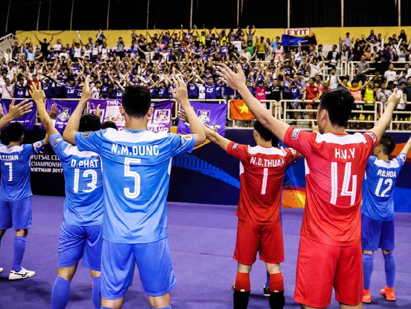 Các cầu thủ Thái Sơn Nam cảm ơn người hâm mộ đến kín nhà thi đấu Phú Thọ, biến nơi đây thành ngày hội Futsal của châu Á. Ảnh: HUY PHẠM
