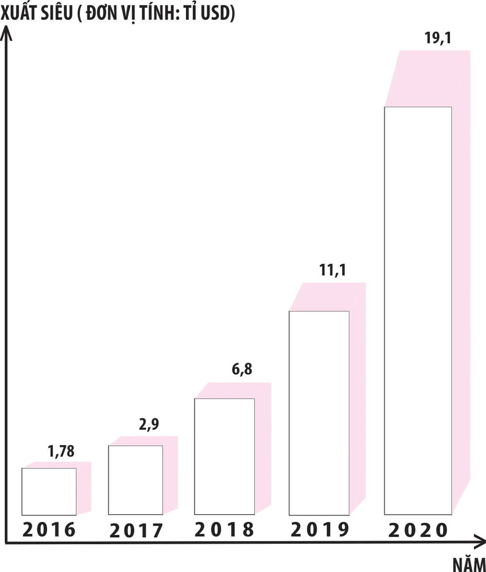 Xuất siêu của Việt Nam liên tục tăng trong các năm từ 2016 đến 2020.