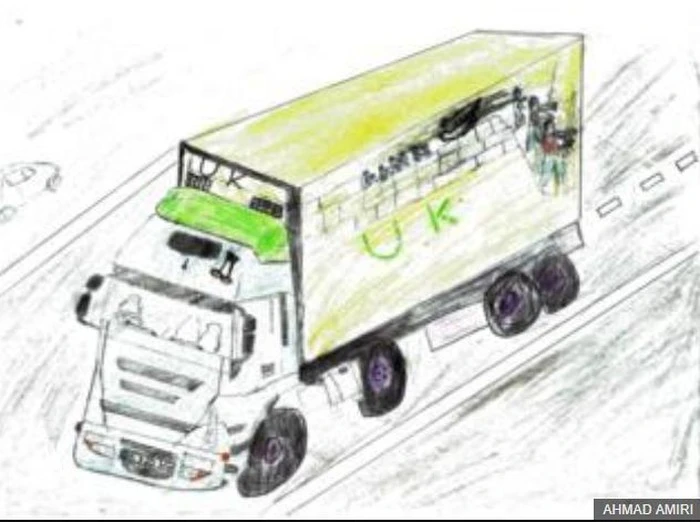 Ahmad vẽ chiếc xe container đưa anh em mình từ trại di dân ở Pháp vào Anh. Ảnh: BBC