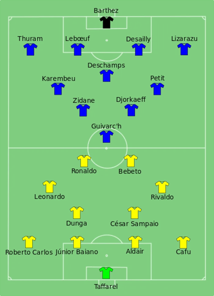 Trấn giữ khung thành Pháp khi đó là thủ thành có cái đầu hói Fabien Barthez, bộ tứ vệ lừng danh Lilian Thuram, Marcel Desailly, Frank Leboeuf, Bixente Lizarazu. Hàng tiền vệ Pháp có đội trưởng Didier Deschamps, Emmanuel Petit, Youri Djorkaeff và đặc biệt là nhạc trưởng Zidane. Chỉ có hàng tiền đạo Pháp bị đánh giá là không tương xứng với đẳng cấp của các vị trí còn lại. Thực tế, Pháp lọt vào chung kết gặp Brazil nhờ những bàn thắng từ tuyến hai, còn hàng tiền đạo gần như bất lực trong việc ghi bàn.