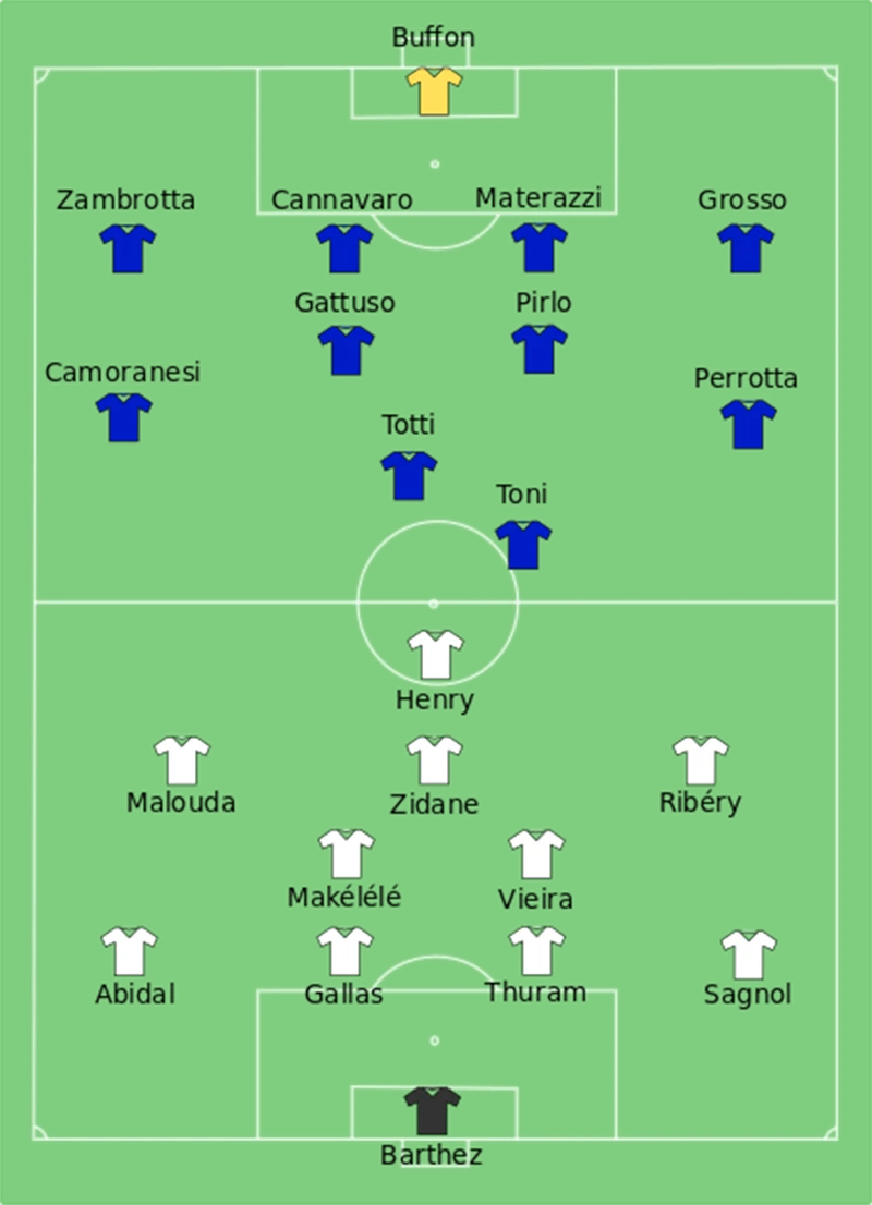 Người Ý bước vào trận với mong muốn trả “mối hận” đã thua Pháp cay đắng trong trận chung kết Euro 2000. Nhưng Ý sớm nhận ngay gáo nước lạnh khi Zidane ghi bàn mở tỉ số cho Pháp trên chấm 11 m ngay ở phút thứ 7. Quả phạt đền theo kiểu Panelka của Zidane ngay chính giữa khung thành đưa bóng chạm cột dọc chui vào lưới Buffon cho thấy bản lĩnh, sự lạnh lùng của Zidane là như thế nào.