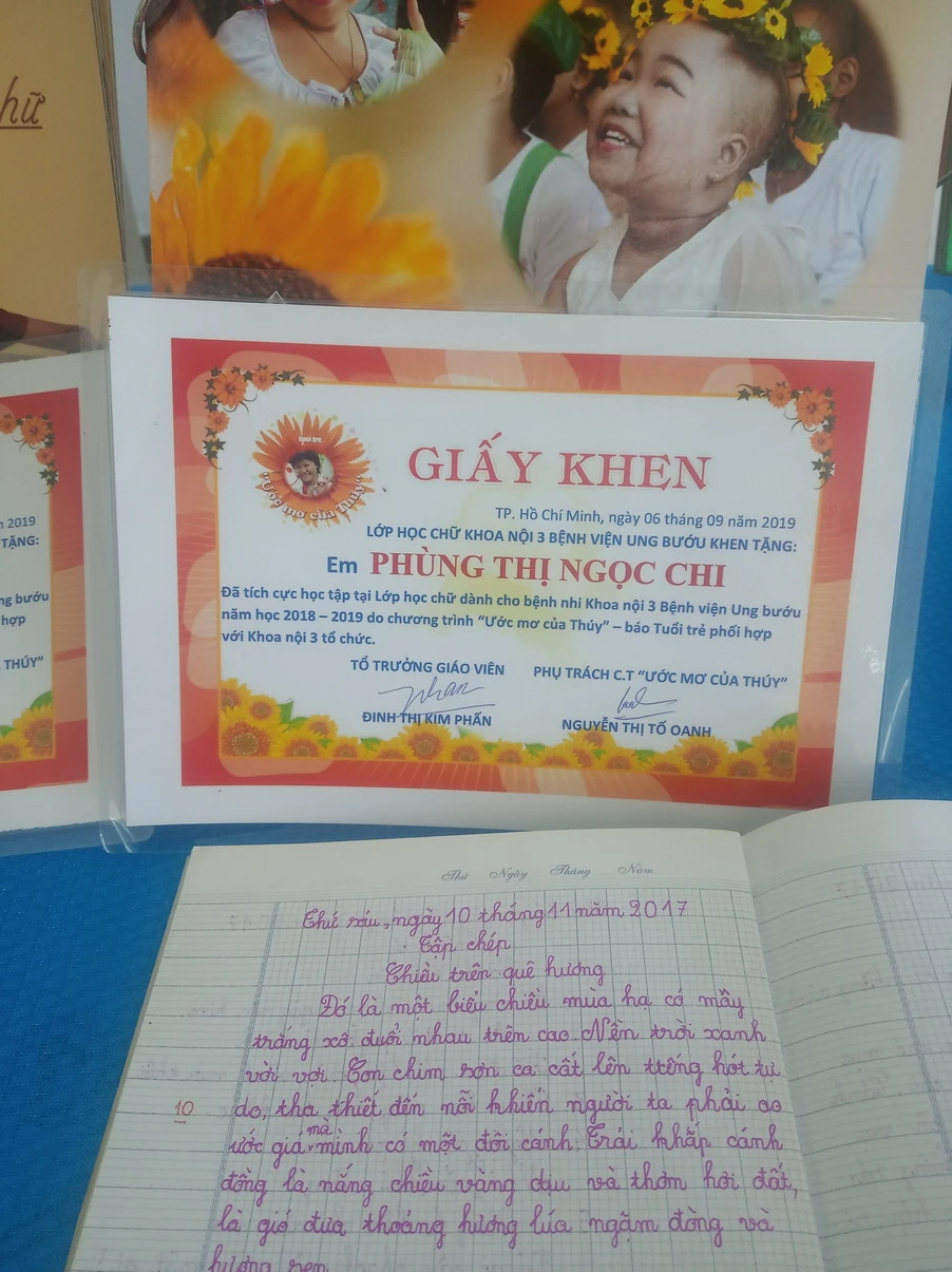 Có những quyển tập mới viết có vài trang đã không còn có thể in dấu mực vì chủ nhân bé nhỏ của nó một ngày bất chợt trút bỏ những cơn đau cuối cùng. Có những quyển tập ghép lại 2-3 cuốn vì bệnh viện đã trở thành nhà của các bé, chung sống với thuốc truyền dịch ròng rã suốt 3-4 năm trời.