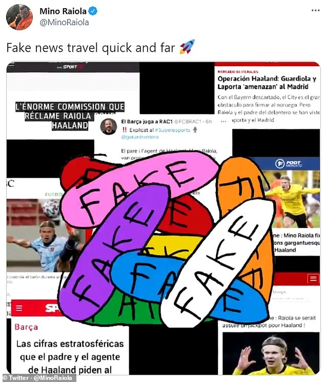 Mới đây, Mino Raiola đã lên tiếng chỉ trích truyền thông và mạng xã hội đưa tin không đúng sự thật về Haaland. Raiola chụp hình hàng loạt trang báo đưa tin về Haaland và gắn nhãn “Fake News” (tin giả).