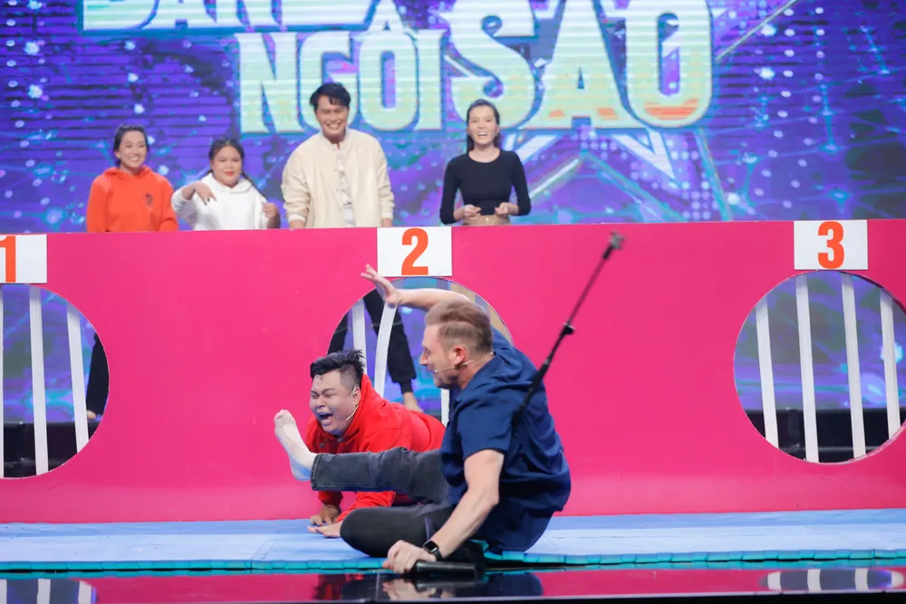 Kyo York phóng như bay giật micro nhưng trả lời sai, mặc khác, chàng trai Tây còn phải nhận hình phạt hít đất vì tội nhắc bài đồng đội.