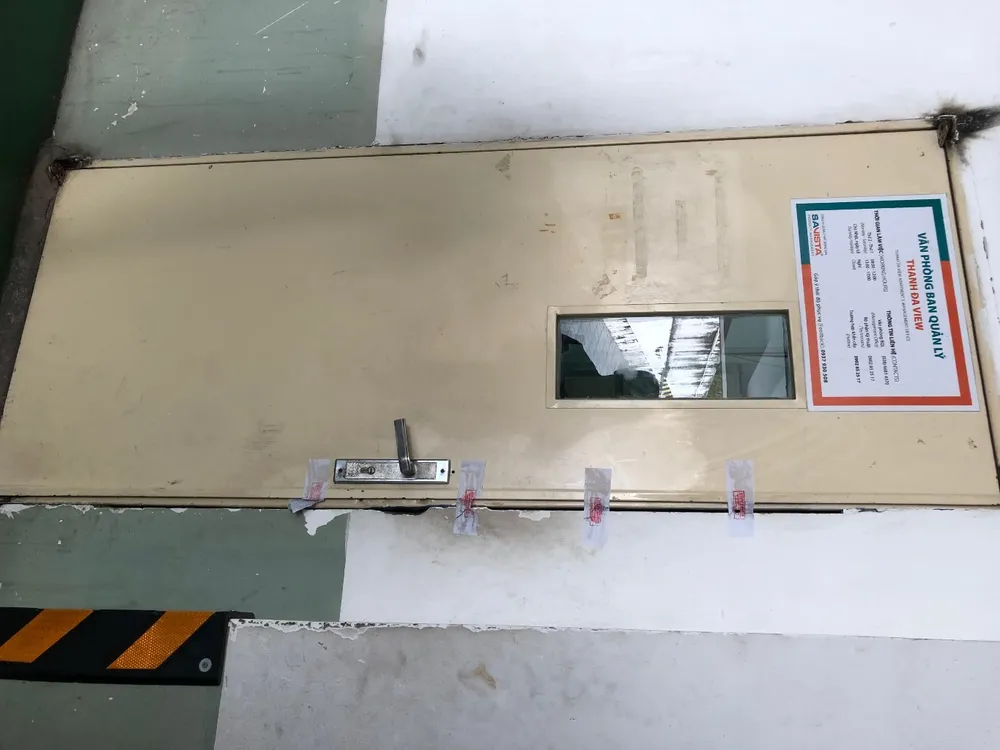 Cửa văn phòng ban quản lý còn dán giấy niêm phong vì công ty quản lý chung cư đã chấm dứt hợp đồng do chưa nhận được phí quản lý.