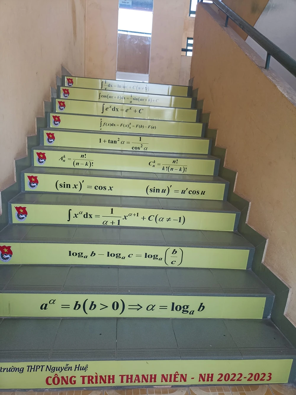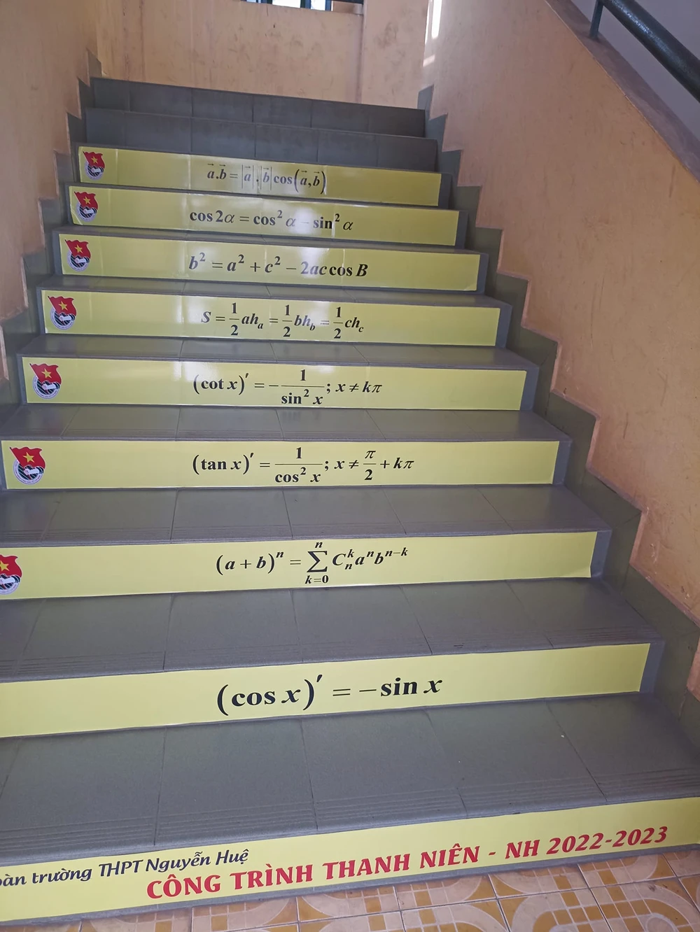 Tương tự, cũng trên những bậc thang bộ nhưng Trường THPT Nguyễn Huệ (TP Thủ Đức, TP.HCM) lại in những công thức về đạo hàm thú vị trong toán học. Được biết, đây là ý tưởng thực hiện công trình thanh niên của Đoàn thanh niên trường cho năm học 2022-2023 này.