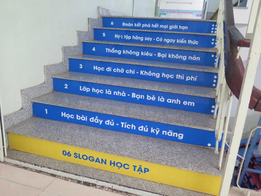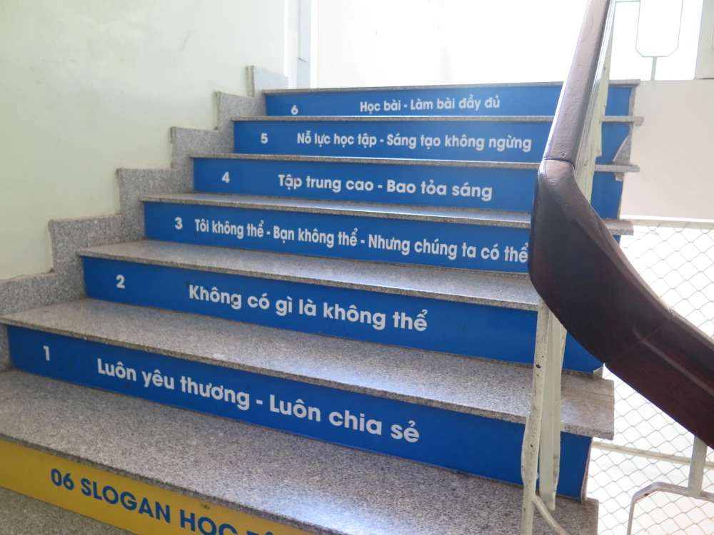 Còn với Trường THCS Lạc Hồng (quận 10), một ngôi trường khá nhỏ với sức chứa khoảng 1.200 học sinh nhưng nhiều người không khỏi bất ngờ khi nhìn thấy những dòng chữ in trên từng bậc thang nơi đây.