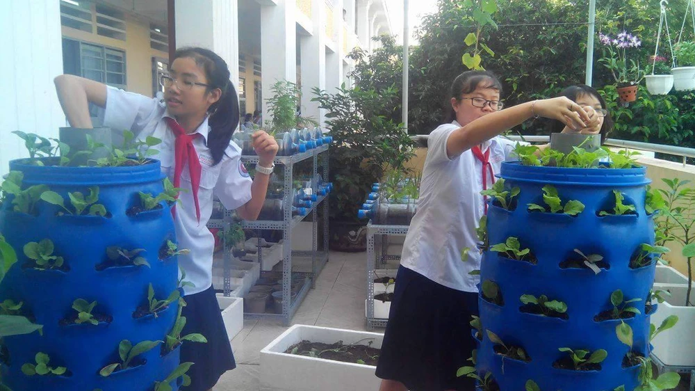 Xuất phát từ ý tưởng của cô Hiệu trưởng Trần Thúy An và sự hướng dẫn của giáo viên tổ Sinh học, nhóm HS khoảng 20 em lớp 8A1 và 8A2 đã xung phong tự tay chuẩn bị và hoàn tất vườn cây này. Trong đó, hai em phụ trách chính là Nguyễn Lê Khanh và Trần Việt Mai Phương.