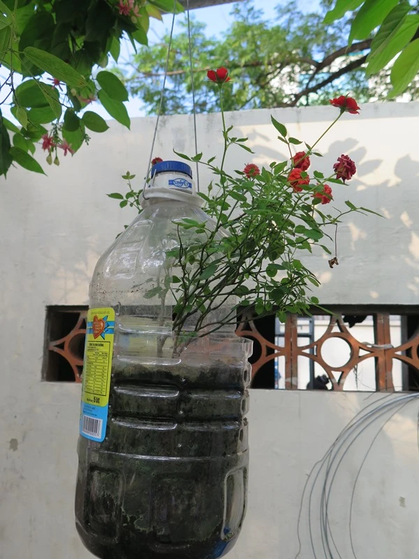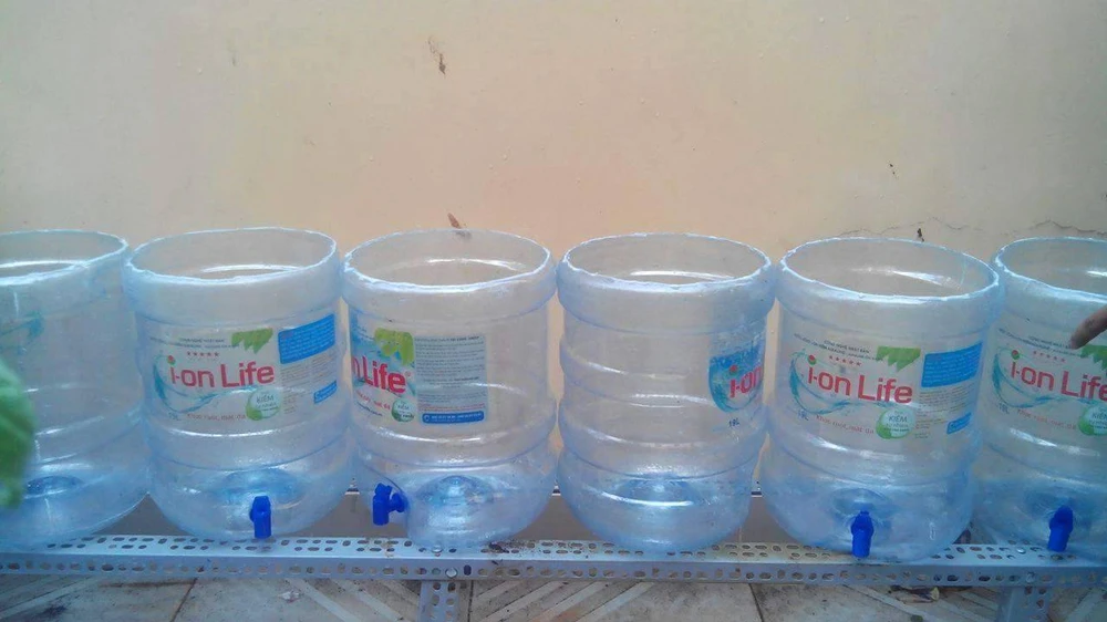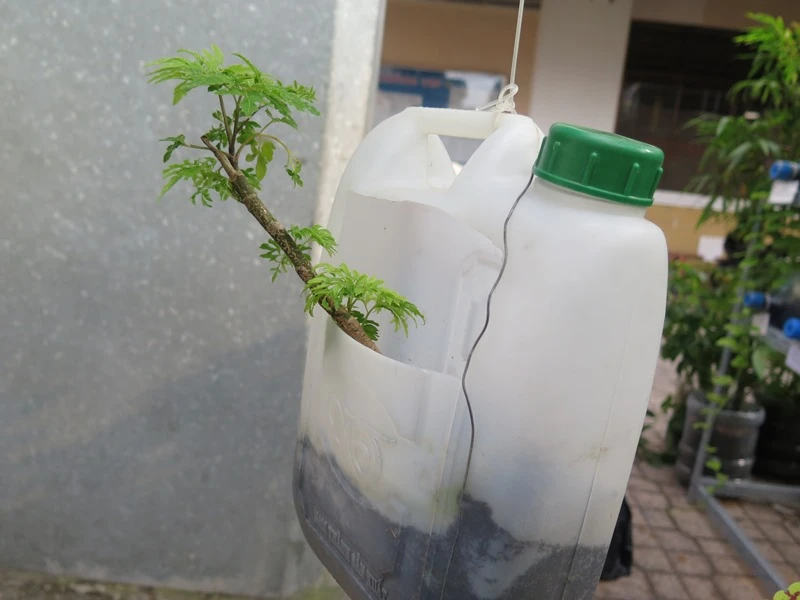 Còn lại, các em tận dụng các vỏ chai lọ, hộp, bình nước cũ, bồn nước và tất cả vật dụng đã qua sử dụng để chắp ghép lại, cắt đục lỗ thoát nước.