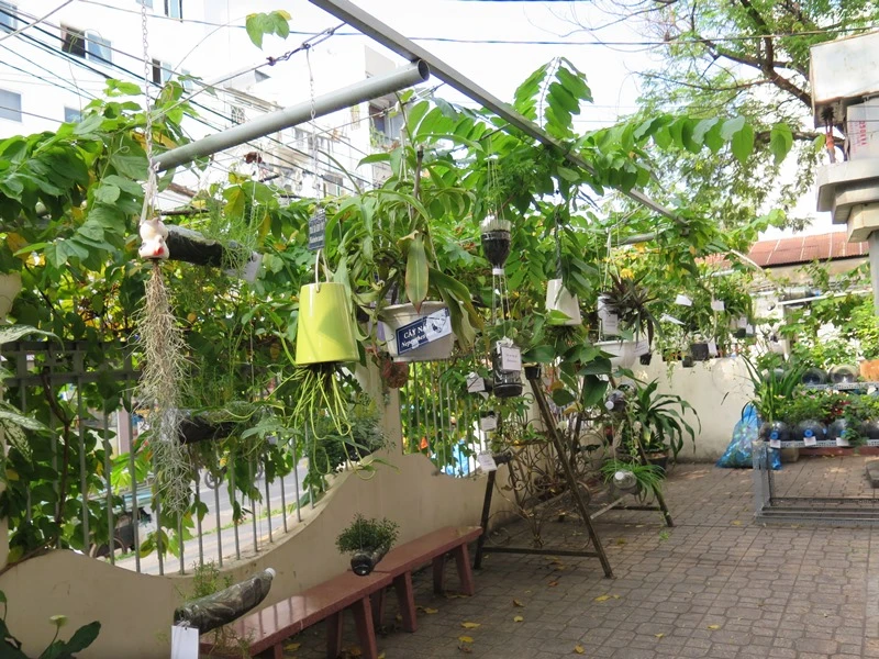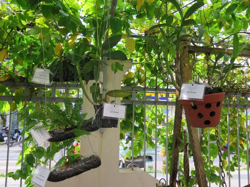 Tổng vườn cây này có hai bồn nước khổng lồ, 52 bồn nước to loại 21 lít và 26 bồn nước nhỏ, cùng nhiều loại thùng ống khác. Tại đây, hàng chục loại cây đã được các em chăm trồng rất cẩn thận như nhóm rau củ quả, nhóm rau thơm, cây cảnh, các loại cây thuốc... Mỗi cây đều được gắn chú thích bằng tiếng Việt và tiếng Anh để mọi người dễ nhận biết. Mỗi ngày, các em cũng tự phân công nhau để chăm tưới.