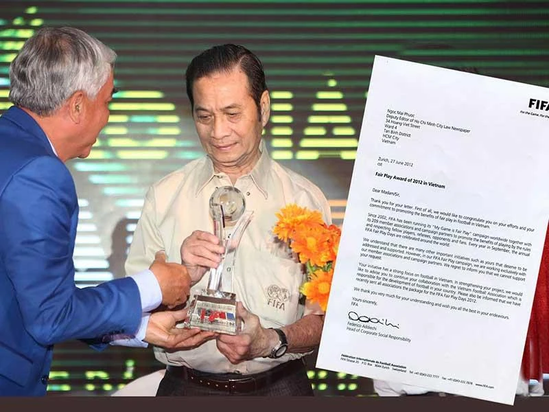 Lá thư FIFA gửi báo Pháp Luật TP.HCM từ lần tổ chức đầu tiên và trao danh hiệu “Vinh danh Fair Play” cho ông Tam Lang. Ảnh: XUÂN HUY