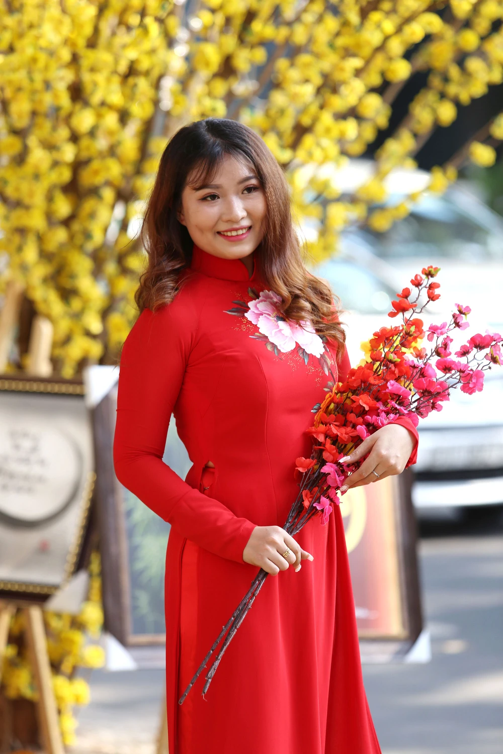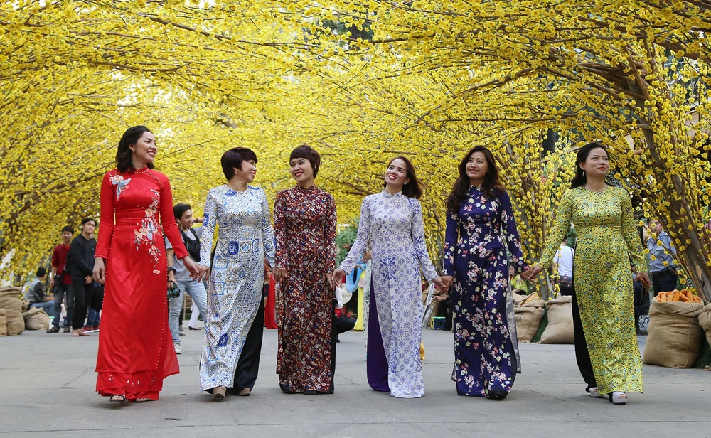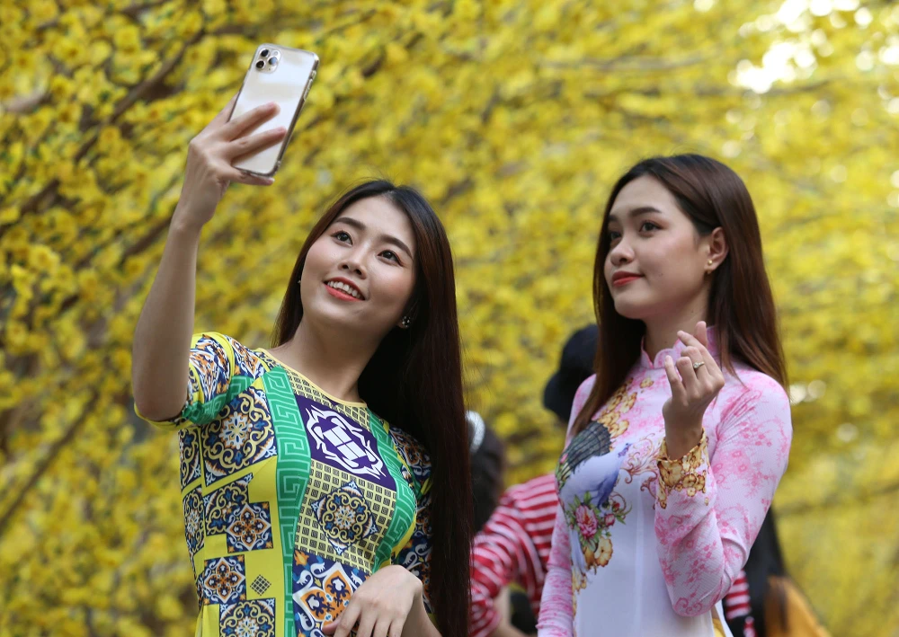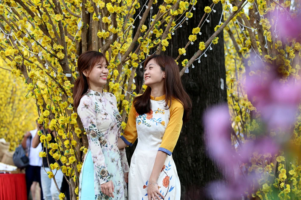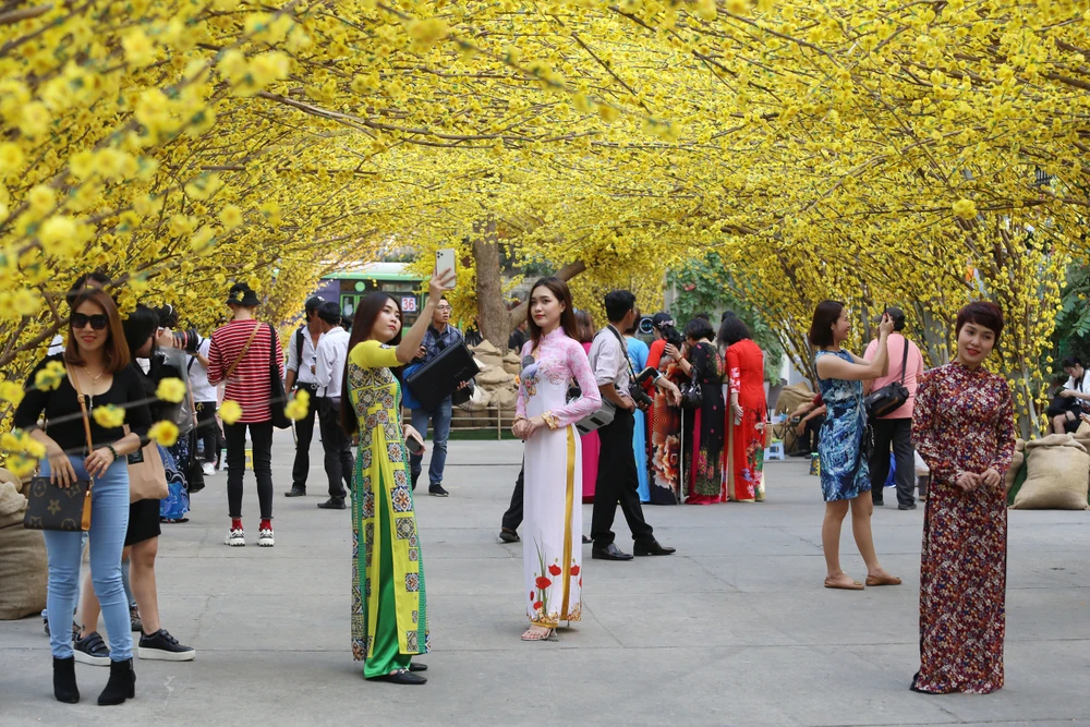 Nhiều bạn trẻ diện áo dài chụp ảnh đón xuân.