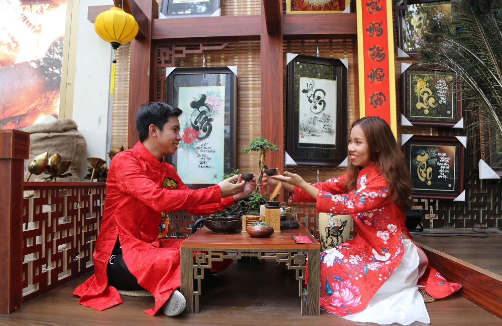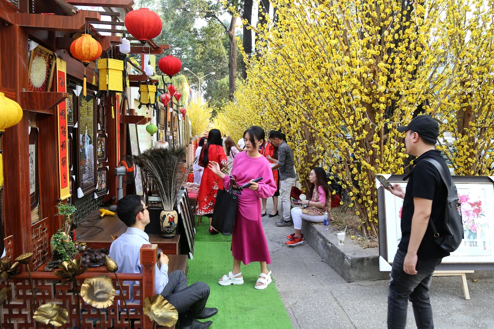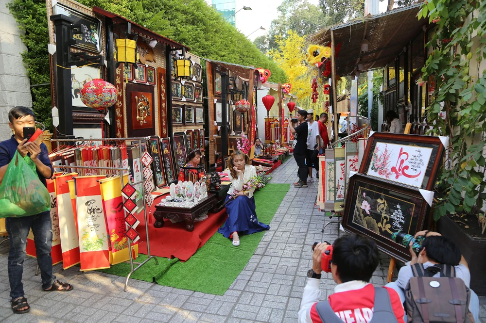 Hai bạn Nguyễn Công Tạo và Thanh Nhung từ quận Gò Vấp đến Nhà văn hóa Thanh niên để trải nghiệm lễ hội. "Đây là năm đầu tiên em đến phố ông đồ, cảm giác nơi đây được trang hoàng rất đẹp, có mai và các tiểu cảnh để chụp ảnh rất thú vị" - Thanh Nhung chia sẻ.