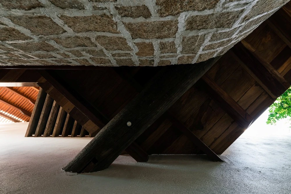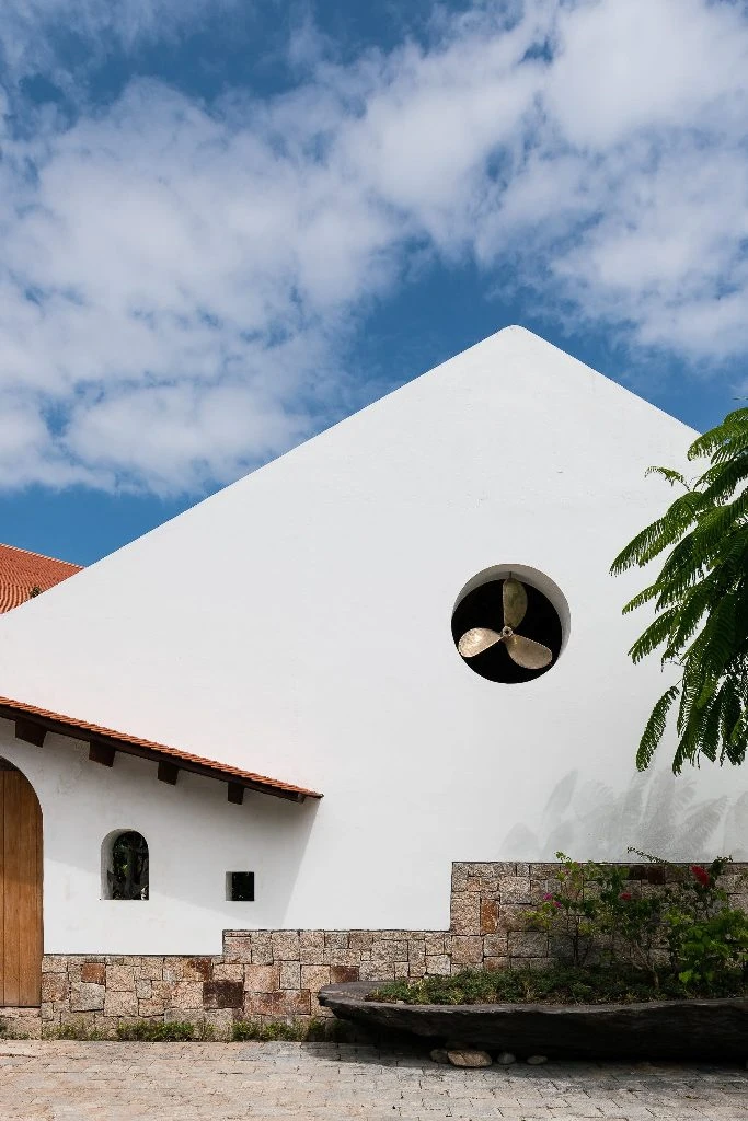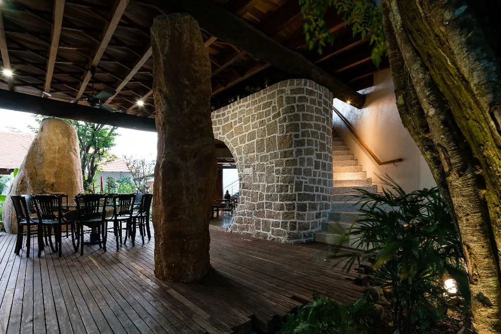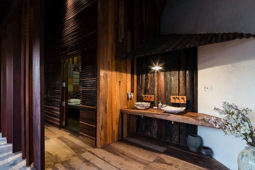 Nhóm thiết kế lấy ý từ những ngôi nhà sàn Bắc bộ, kết hợp với phần lớn vật liệu tự nhiên, đưa vào công trình một cách nhẹ nhàng nhất, hòa vào tổng thể sân vườn với nhiều cấp độ cây xanh cao thấp, hồ nước.