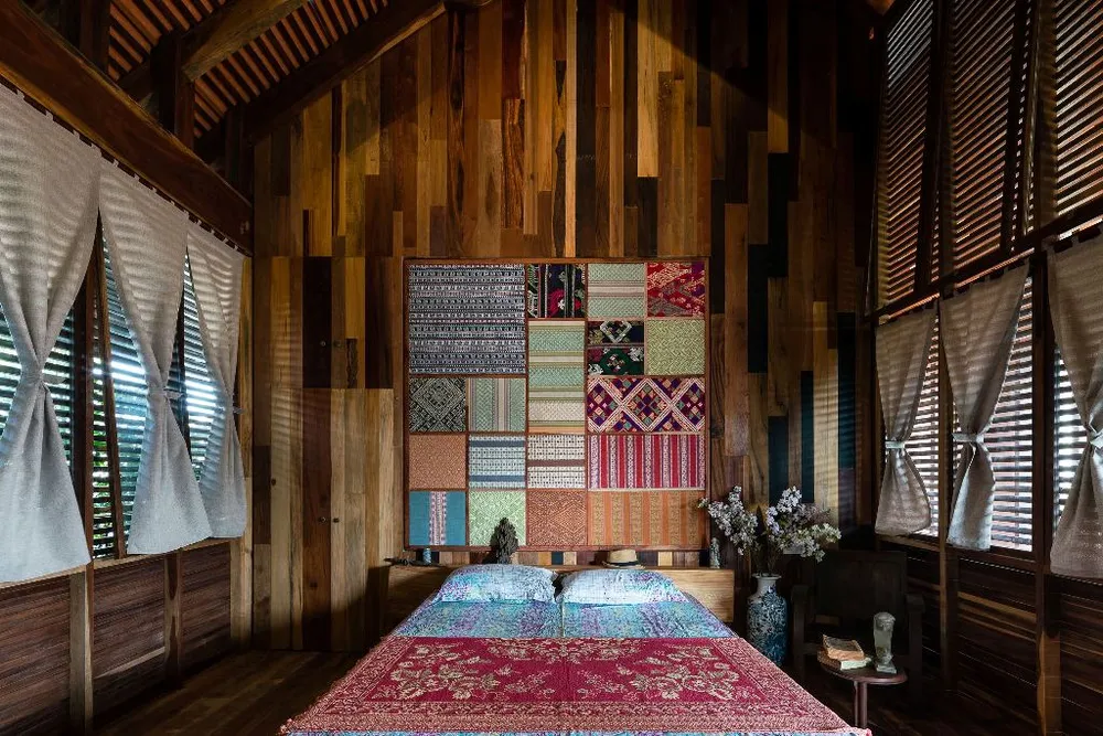 Phòng ngủ tầng hai với thiết kế tông màu thổ cẩm đậm phong cách đồng bằng Bắc bộ.