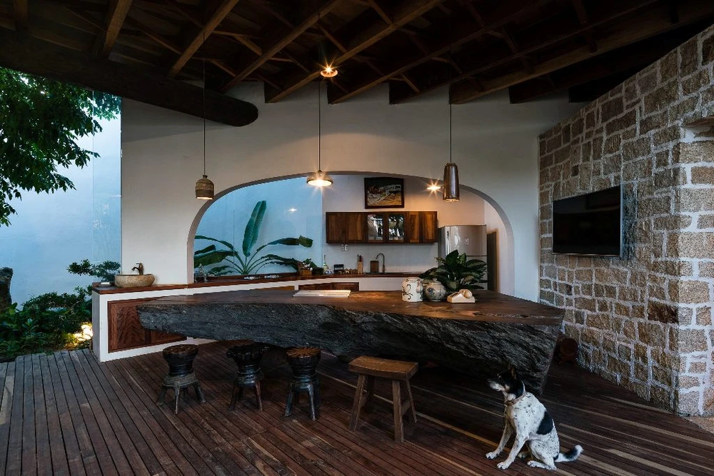 Ngoài ra, nhìn vào tổng thể ngôi nhà tất cả dường như không sơn nhẵn chỉ ốp gạch đầy chất dân dã, thân thuộc.