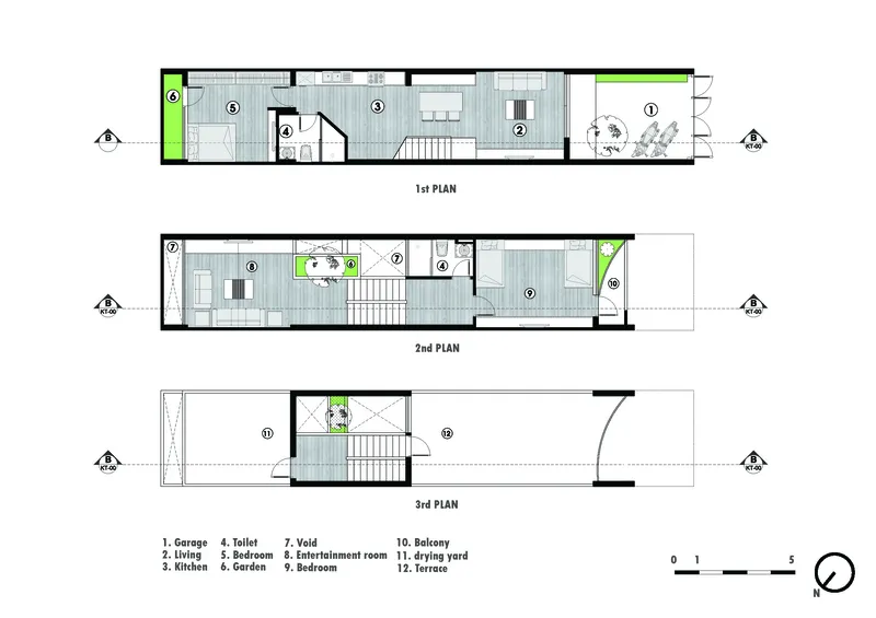 Trong không gian này, chúng ta có thể cảm nhận rõ ràng sự hiện diện của cây xanh và ánh sáng. Nó được kết nối với phòng ngủ của trẻ nhỏ ở trên cũng như các vệt nắng của cầu thang. Với cách bố trí trật tự, khu vực sử dụng được tối ưu hóa và tràn ngập mảng xanh.