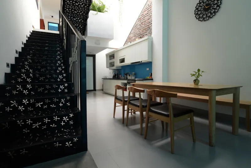 Khu vực ăn uống và bếp nấu gần như tận hưởng đầy đủ các yếu tố tự nhiên nhờ sự khéo léo của kiến trúc sư. Đi lên trên là không gian sinh hoạt chung nằm trong khu vực gác lửng do bố trí kiểu lệch tầng.