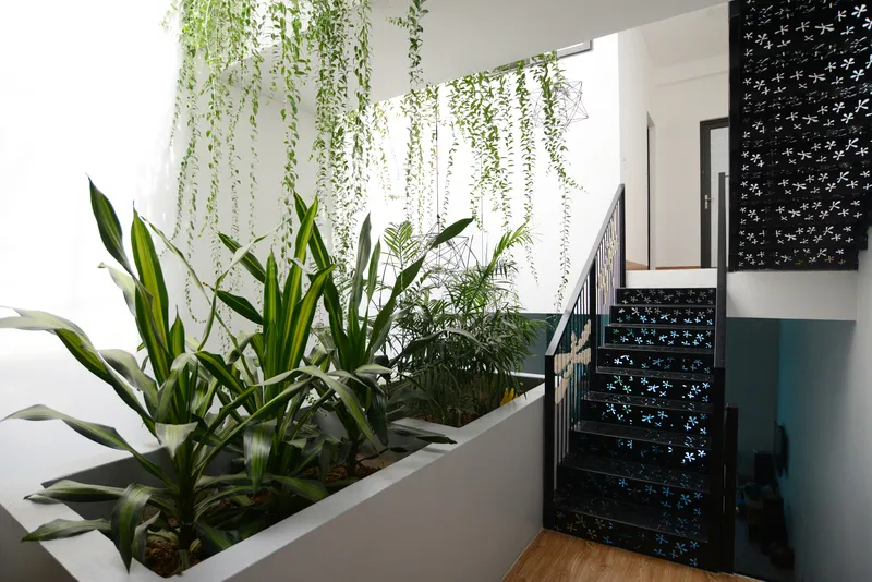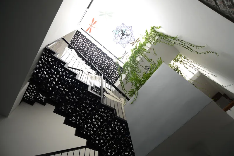 Các chi tiết cầu thang được tính toán tỉ mỉ với vô số bông hoa rỗng trên mỗi bước. Nó làm cho việc tiếp cận với thiên nhiên trong một khái niệm trừu tượng thú vị.