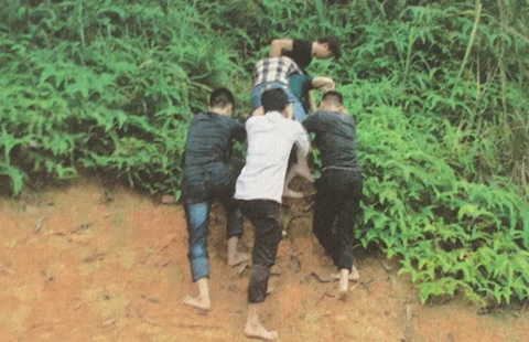 Cảnh các ông Bàn Văn Thái, Bàn Văn Tiếp, Đặng Văn Quang, Đặng Văn Tuyên, Đặng Việt Sơn đang thực nghiệm hiện trường vụ giết người do CQĐT quy buộc. Ảnh: Tư liệu
