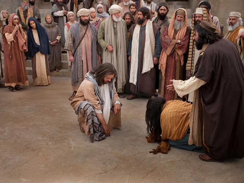 Người phụ nữ phạm tội ngoại tình bị dân chúng dẫn đến hỏi Chúa Giê-su xem xử sao. Chúa phán: “Ai trong các ngươi vô tội thì hãy ném đá người này trước đi”.