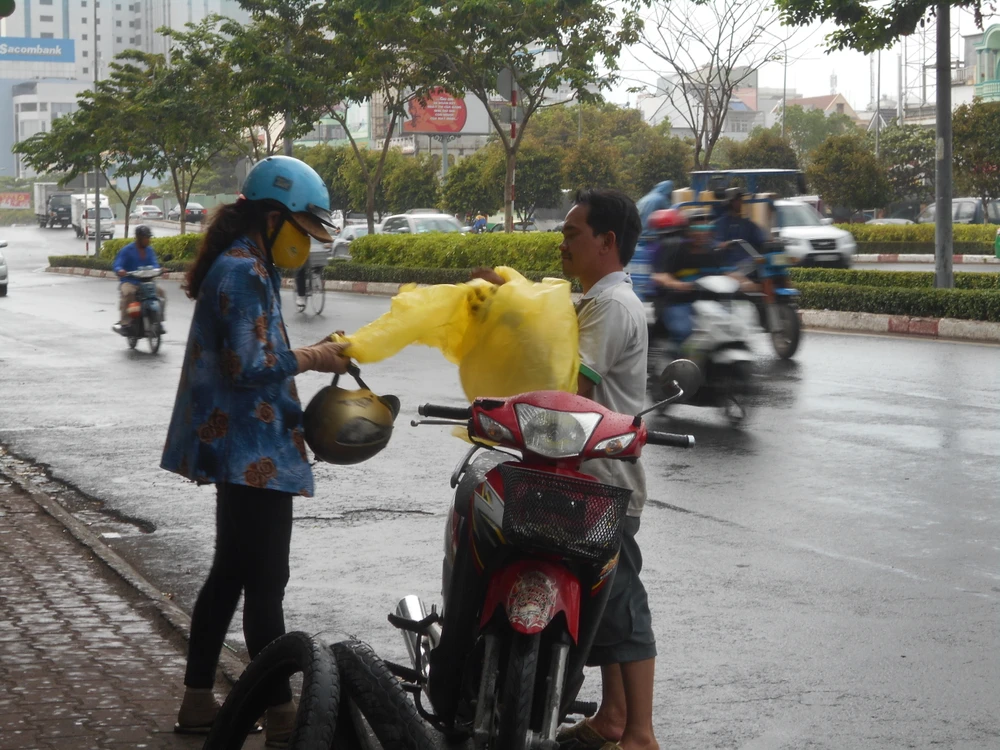 Mọi người đã "thủ" sẵn áo mưa để không lo ướt khi cơn mưa bất chợt ập đến. Ảnh chụp trên đường Điện Biên Phủ, quận Bình Thạnh. ẢNH: THANH TUYỀN