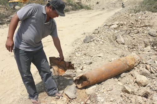 “Quả bom được phát hiện đã hơn một ngày rồi, nhưng chẳng thấy cơ qua chức năng đến giải quyết quả bom cả. Trước đây cũng ở khu vực này chúng tôi cũng phát hiện 8-9 quả bom giống thế này”, anh Trúc, một lái xe múc tại đây cho biết.