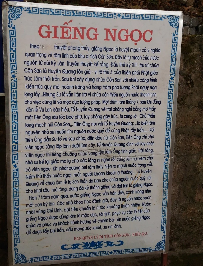 Bảng thông tin về giếng Ngọc đặt tại sân giếng Ngọc, phía sau chùa Côn Sơn.