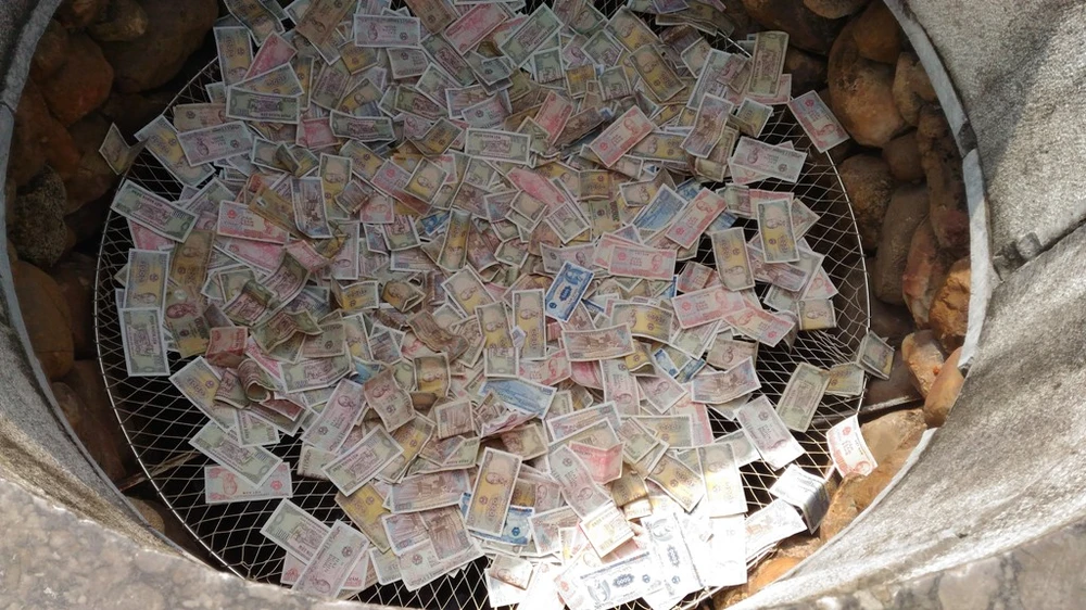 Tiền lẻ cũng được rải kín mặt giếng Mắt Rồng tại đền Kiếp Bạc.