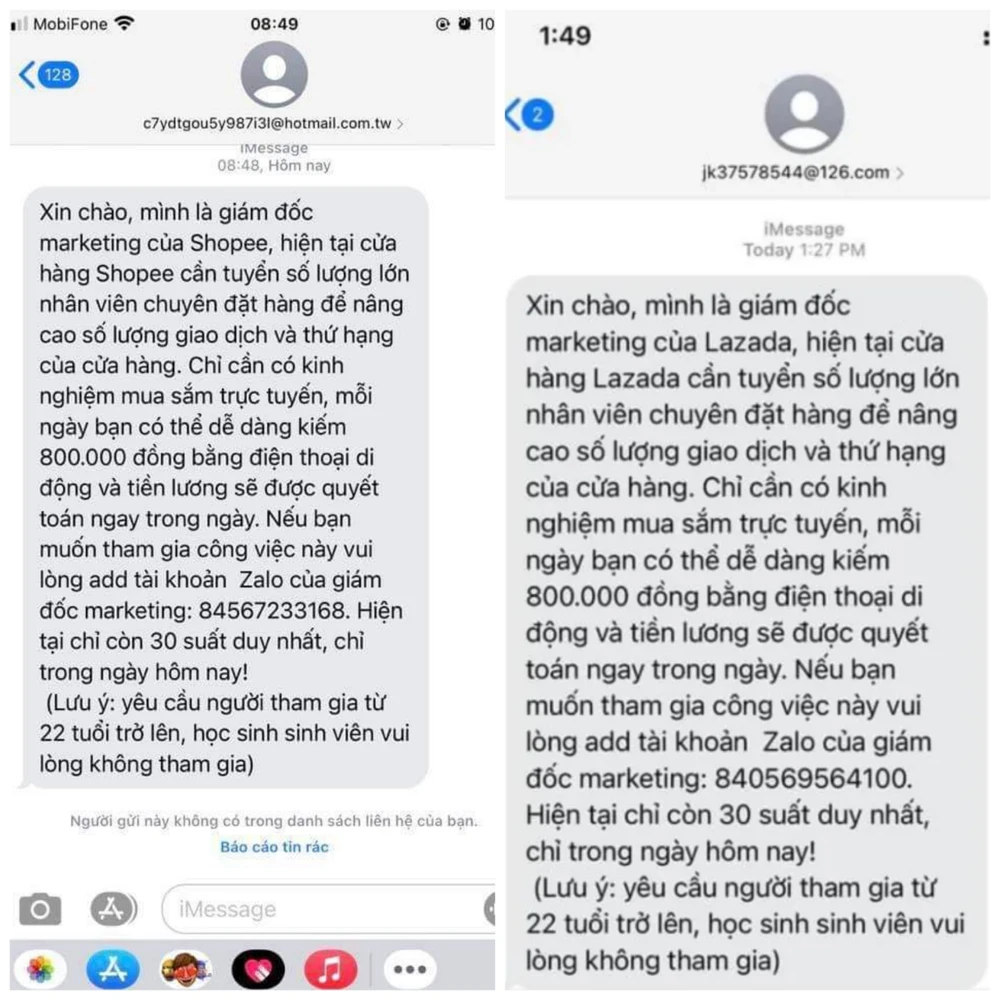 Cụ thể, những tin nhắn này xưng là giám đốc marketing hoặc nhân viên phòng nhân sự của các sàn thương mại điện tử (TMĐT) như Tiki, Shopee và Lazada, đang cần tuyển dụng số lượng nhân viên chuyên đặt hàng để nâng cao số lượng giao dịch và thứ hạng của cửa hàng.