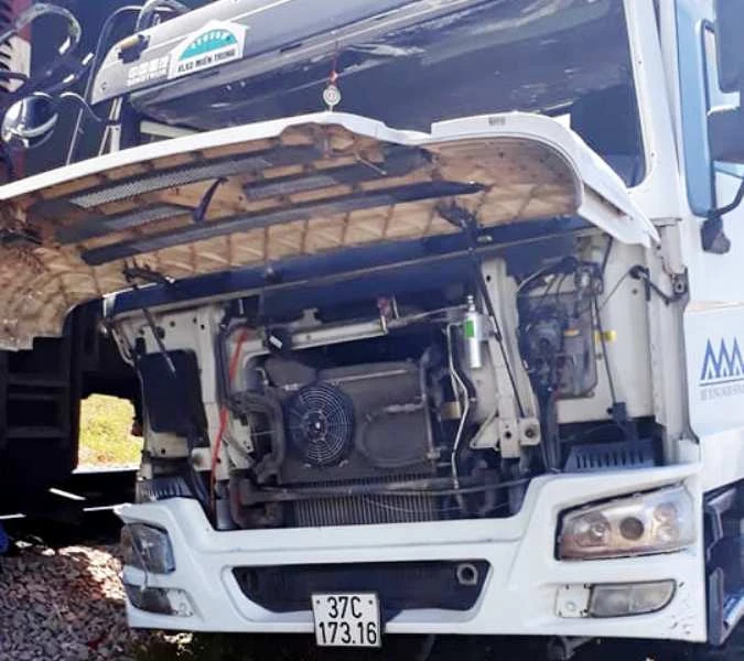 Cú tông khiến xe bồn văng đi, xoay dọc bên đường sắt, vỡ kính trước và hư hỏng nặng.