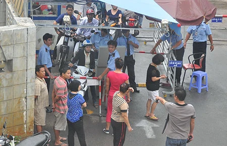 Một nhóm nhân viên Công ty 584 nhất quyết không lấy thẻ từ, khóa cổ, dừng xe choán lối vào chung cư. Ảnh: MP