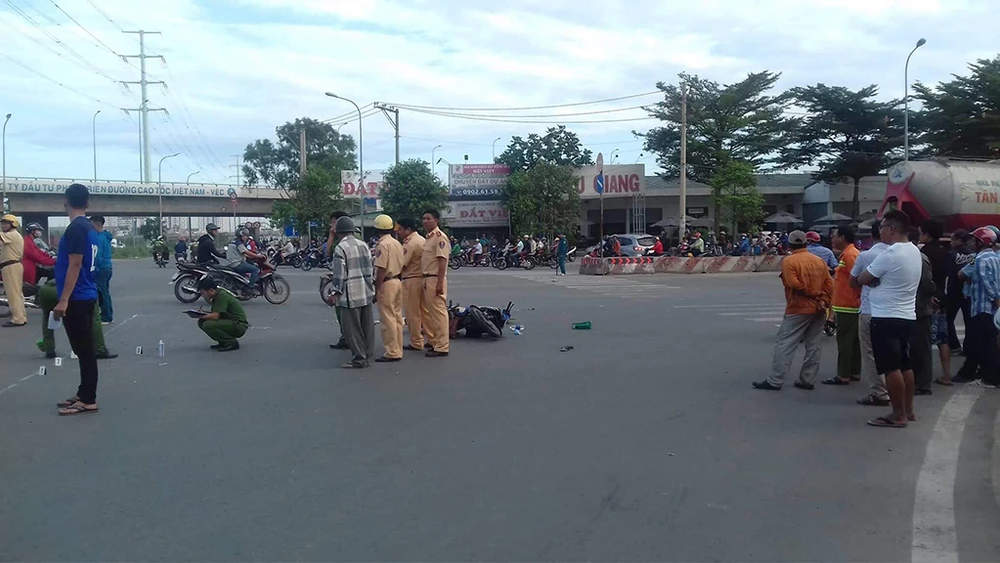 Tại hiện trường, chiếc xe máy hư hỏng nặng nằm cách khá xa chiếc xe bồn, giao thông qua khu vực khó khăn.