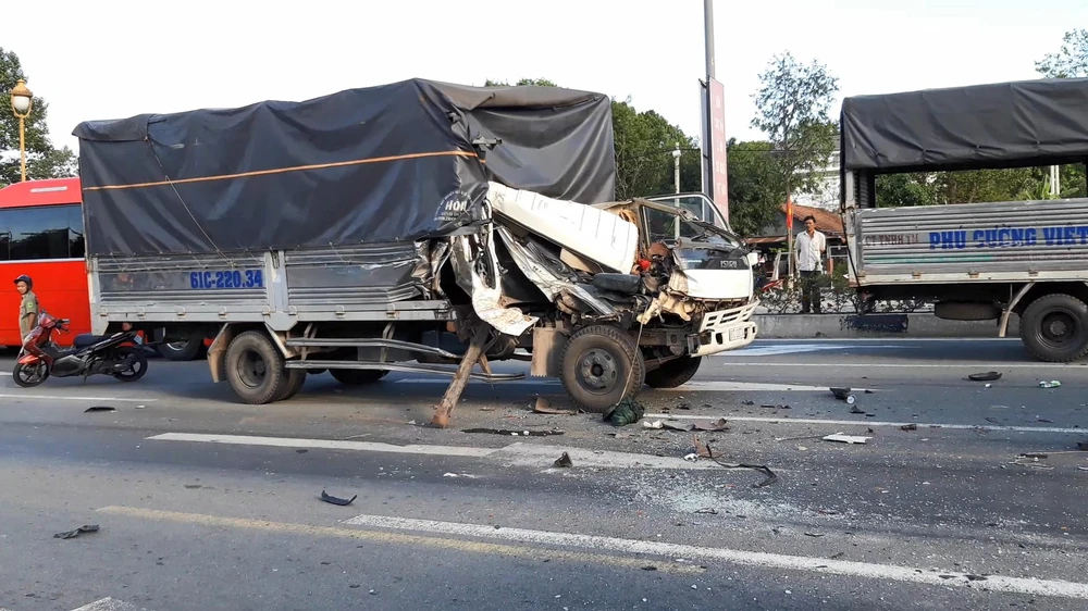 Người dân chứng kiến vụ tai nạn cho biết, vào khoảng 16 giờ 30 (ngày 5-1), xe ô tô tải mang biển số 61C-220.34 chạy với tốc độ cao bất ngờ đâm vào một xe tải đang dừng đèn đỏ trên đường Phạm Ngọc Thạch (phường Hiệp Thành, TP. Thủ Dầu Một, Bình Dương).