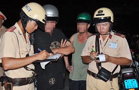 CSGT TP.HCM đang ghi kết quả đo nồng độ cồn người vi phạm. Ảnh: MP
