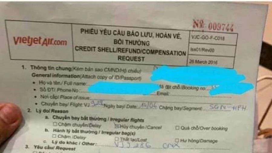 Phiếu yêu cầu bảo lưu, hoàn vé, bồi thường của một hành khách mua vé Vietjet khi bị hủy chuyến bay hôm 15-6. Ảnh: NTT