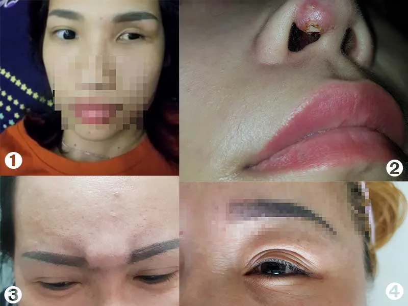 Ảnh 1: Mắt trái của chị L. bị mù sau khi tiêm filler nâng mũi tại spa kiêm phẫu thuật thẩm mỹ “chui”. Ảnh 2: Nâng mũi bằng silicon khiến mũi hoại tử mô, lòi cả thanh silicon ra ngoài. Ảnh 3: Chống nhăn trán để phải lãnh cục u giữa hai chân mày. Ảnh 4: Nhấn từ mắt một mí thành… bốn mí. Ảnh: H.LAN