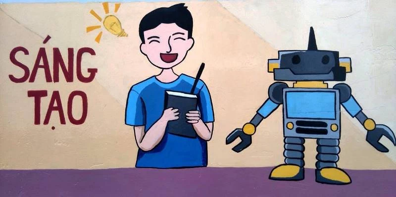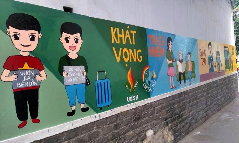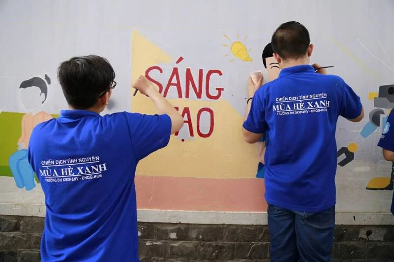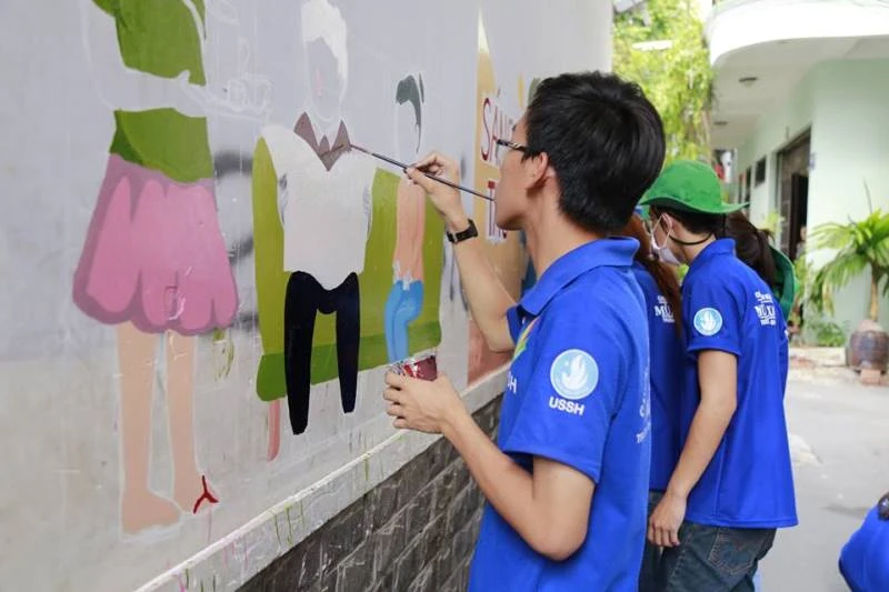 Bức tường dần hiện lên sống động hơn qua nét vẽ của các bạn sinh viên. Ảnh: THANH TUYỀN