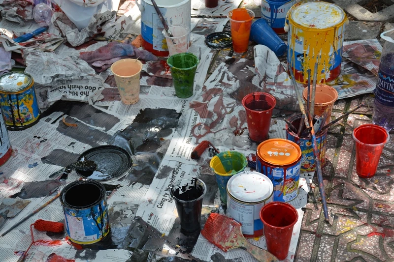 Những lọ sơn được bày ra khắp nơi, sau đó sẽ được dọn dẹp sạch sẽ khi vẽ xong.