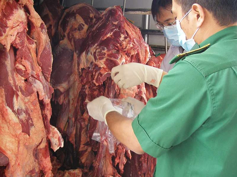 Cơ quan chức năng TP.HCM đang lấy mẫu thịt xét nghiệm kháng sinh. Ảnh: TRẦN NGỌC