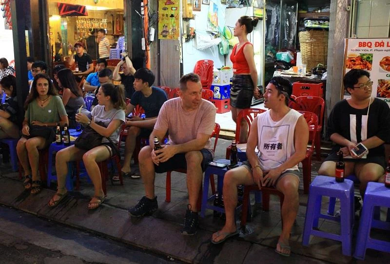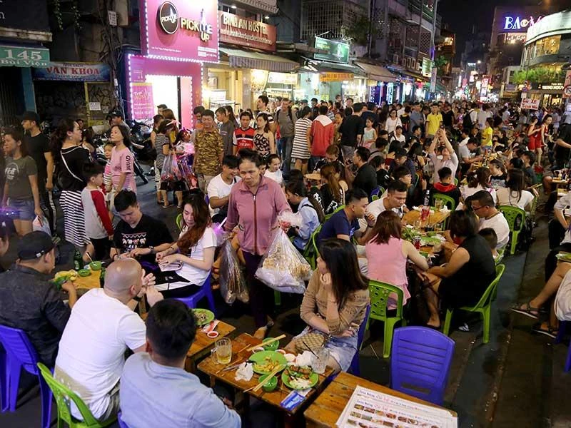 Việc tăng cường du lịch vào ban đêm sẽ khuyến khích du khách ở lại VN lâu hơn, từ đó sẽ thúc đẩy tiêu dùng vào ban đêm. Trong ảnh: Người dân và du khách vui chơi, ăn uống trên phố đi bộ Bùi Viện mỗi tối. Ảnh: HOÀNG GIANG