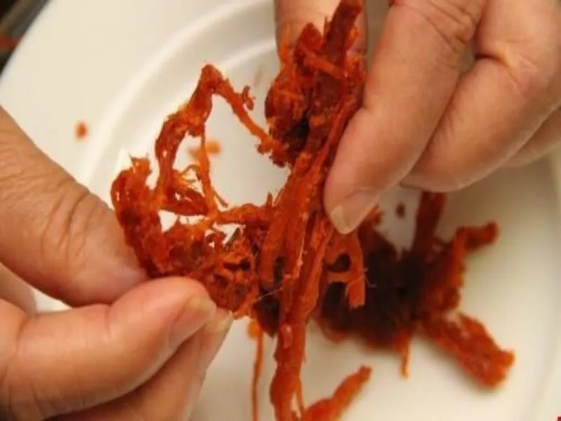 - Thịt bò khô thật sẽ có màu vàng sẫm, sợi dài, to... Thịt giả thường có màu đỏ vừa đến đỏ thẫm nhờ phẩm màu.