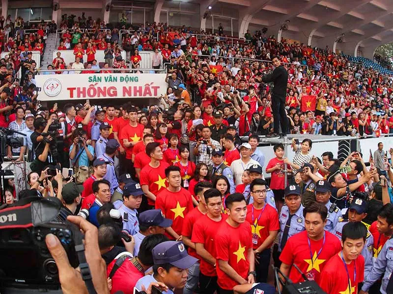 Sân Thống Nhất sau thời gian dài nguội lạnh giờ nóng thật nóng khi đón các cầu thủ U-23 Việt Nam. Ảnh: PHẠM HUY