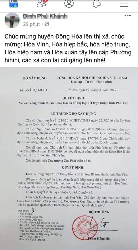 “Ngay sau khi phát hiện quyết định giả này trên mạng xã hội Facebook, chúng tôi đã chỉ đạo đài truyền thanh huyện thông tin, tuyên truyền đầy đủ đến người dân trên địa bàn huyện để tránh mắc mưu, bị lừa. UBND huyện Đông Hòa cũng đã có công văn hỏa tốc gửi các cơ quan, đơn vị trên địa bàn tỉnh Phú Yên thông báo nội dung giả quyết định của bộ trưởng Bộ Xây dựng về công nhận thị xã Đông Hòa là đô thị loại ba”- ông Tiến thông tin.