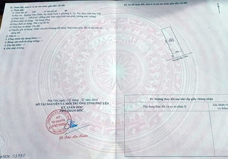 Theo ông Nguyễn Vũ Thụy, Giám đốc Văn phòng Đăng ký đất đai tỉnh Phú Yên, mới đây một người giao dịch mua đất ở TP Tuy Hòa nghi ngờ một sổ hồng bị làm giả đã gửi đến Văn phòng Đăng ký đất đai để kiểm tra. Sổ hồng này có số sêri CE358672, cấp cho thửa đất số 125, tờ bản đồ số 40 tại địa chỉ đường Mậu Thân, khu phố Ninh Tịnh 5, phường 9, TP Tuy Hòa. Thửa đất này rộng 108 m2, được cấp cho hộ gia đình. Trên sổ hồng này thể hiện bà Lê Đào An Xuân, Phó Giám đốc Sở TN&MT tỉnh Phú Yên, ký cấp ngày 4-7.