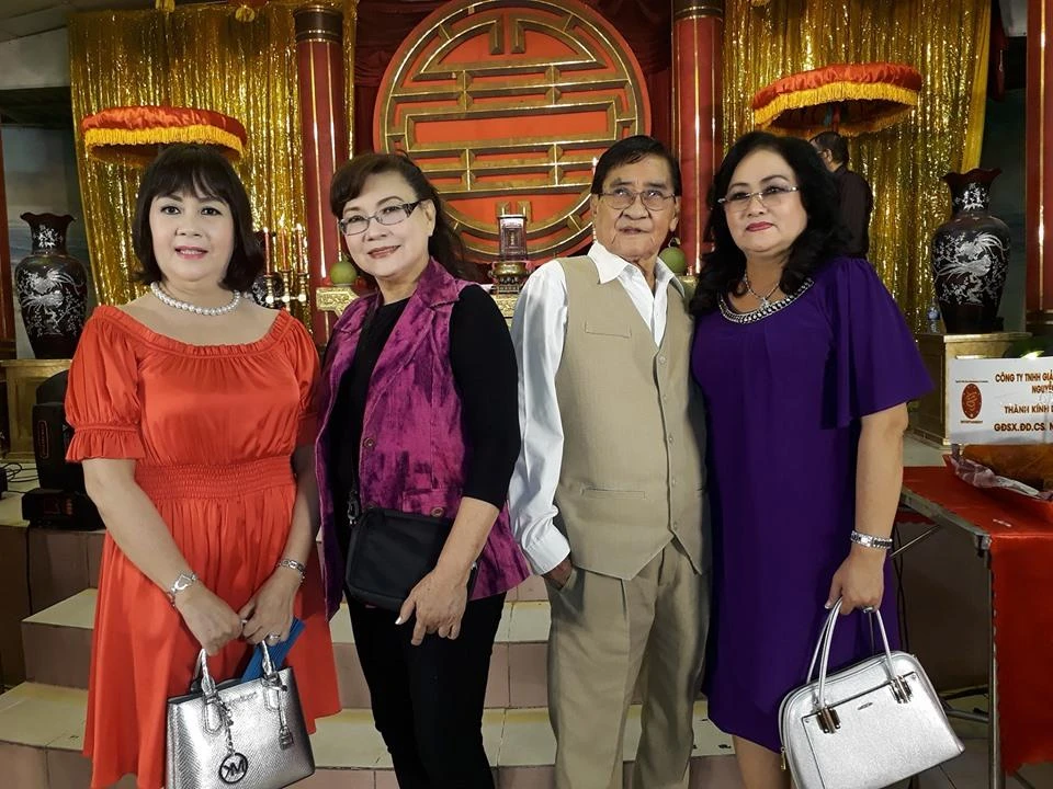 Vợ cố nghệ sĩ Thanh Sang (áo xanh) cùng vợ chồng nghệ sĩ Minh Vương (kế bên).