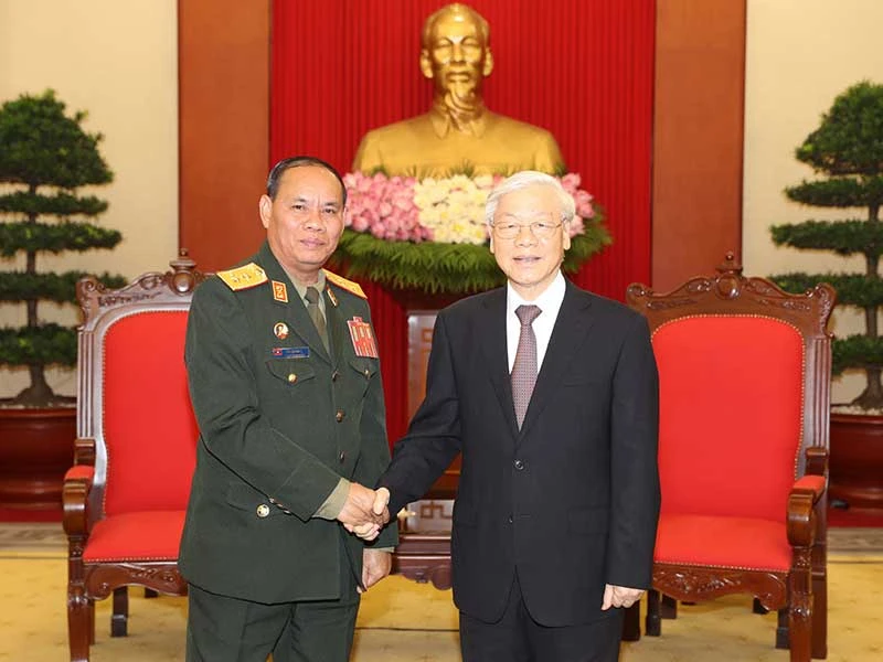 Tổng Bí thư Nguyễn Phú Trọng tiếp Trung tướng Vilay Lakhamphong , Bí thư Trung ương Đảng, Chủ nhiệm Tổng cục Chính trị Quân đội Nhân dân Lào, sang thăm chính thức Việt Nam. Ảnh: TTXVN