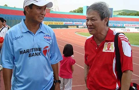 HLV Mai Đức Chung (trái) và Lê Thụy Hải cùng đá chung đội và từng cùng ngồi chung ghế kỹ thuật nhưng khác nhau một trời một vực. Ảnh: XUÂN HUY