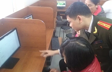 Cán bộ hướng dẫn người dân kê khai làm hộ chiếu online. Ảnh: ND