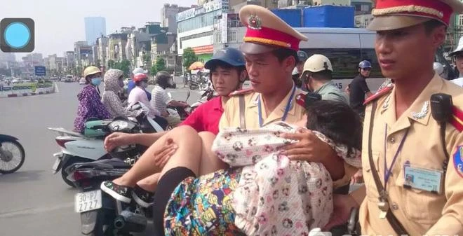 Chiến sĩ CSGT cùng người dân khẩn trương giúp đỡ người phụ nữ mang thai bị thương do va chạm giao thông. Ảnh Soha.